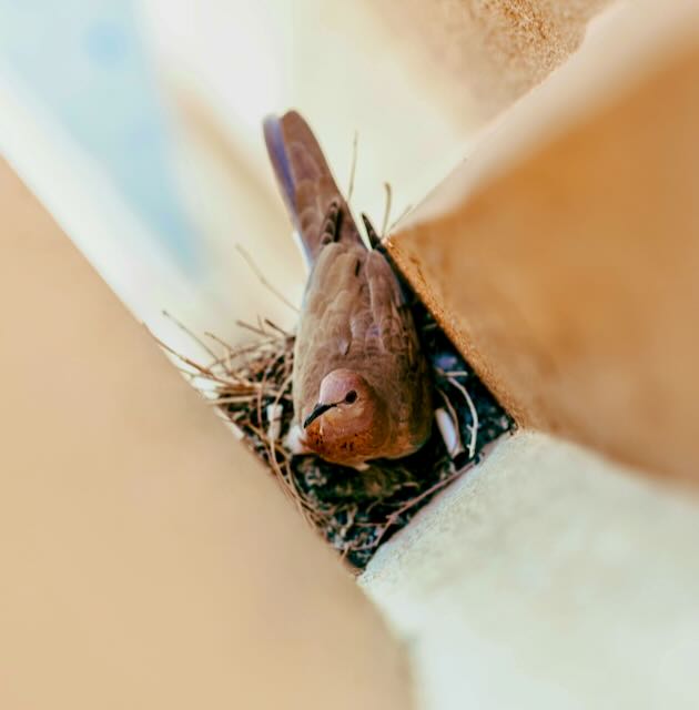 It was the mourning dove, sitting still in her quiet bowl of twigs,